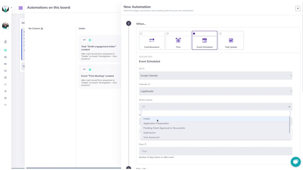 Legalboards has basic automations that will help you to become more efficient. Some of the most common automations we see involve email updates to team members (more on that later), checklist creations, and board (aka matter) management. With the Google Calendar integration, you’ll be able to set up schedule-based events directly based on your workflow. For example, you could create automated events with clients or other important contacts related to a case based on intake or pre-agreement.