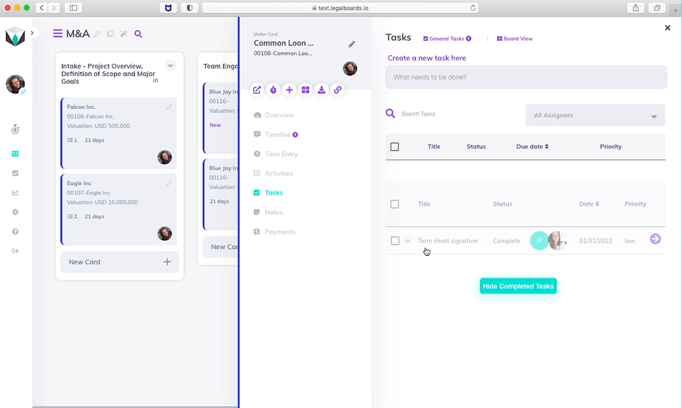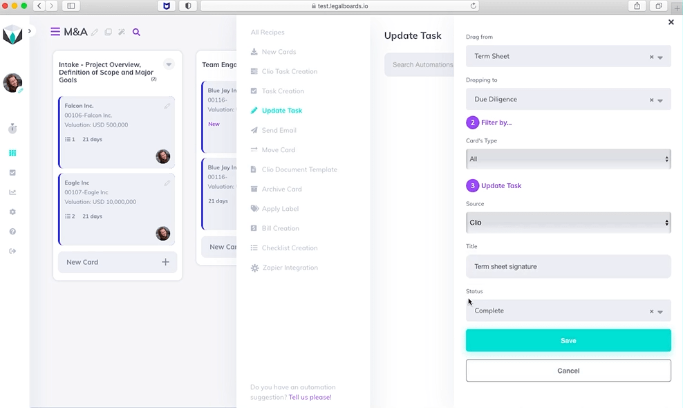- Trigger card movement: Whenever a matter moves from one column to the next in your workflow the system will automatically update the status of previous tasks to complete. In the example above, all matters arriving in the “Due Diligence” should have their term sheet signed already. Therefore, if someone forgot to mark this task as completed the system will automatically do that.