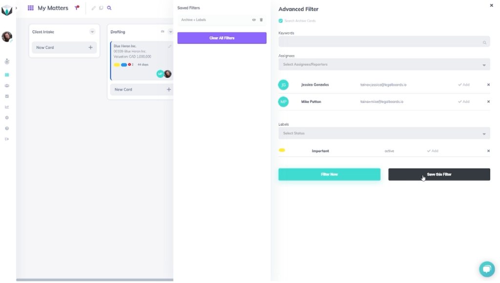 By excluding the keyword information, we can now see more cards on the board. Notice how in addition to the first assignee (Jessica Gonzalas), there is another important assignee. Let’s add that assignee to the filter as well and then save it.