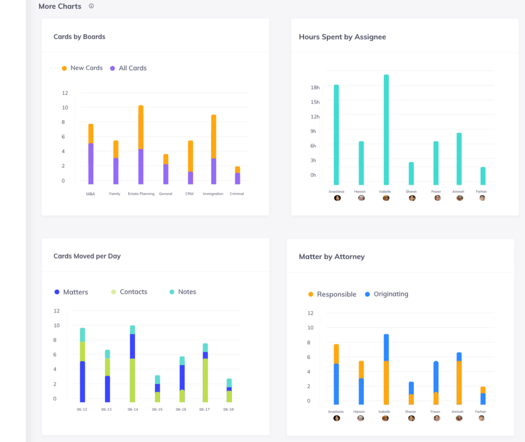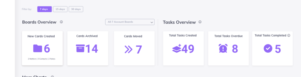- New Cards Today: This number shows you all of the new cards that have been created today. It also breaks down this number by the type of card (matter, contact, or note).